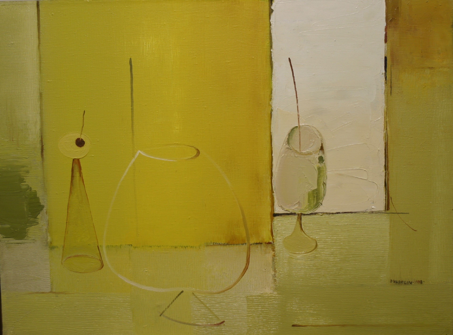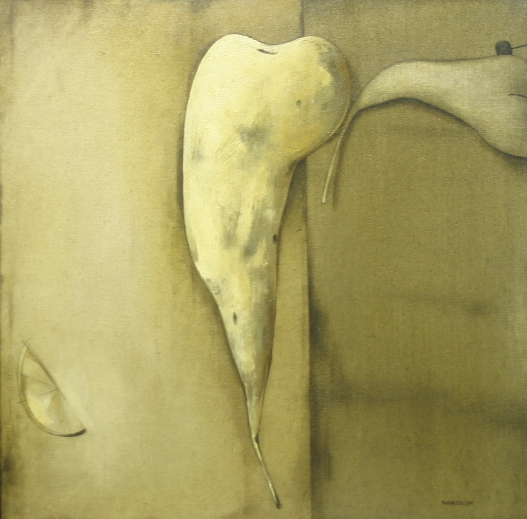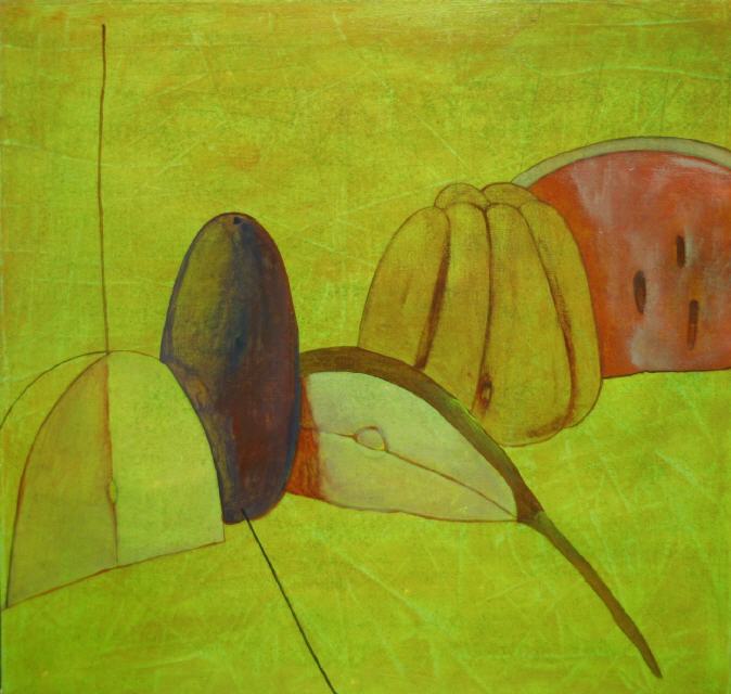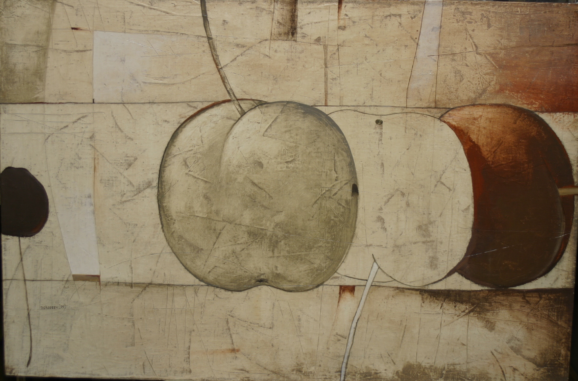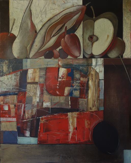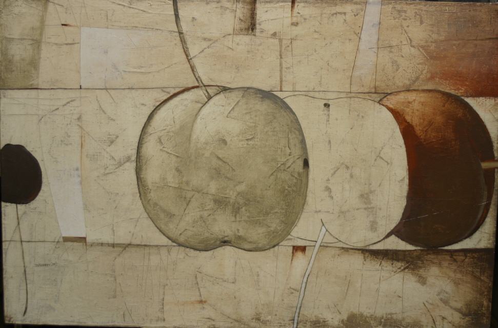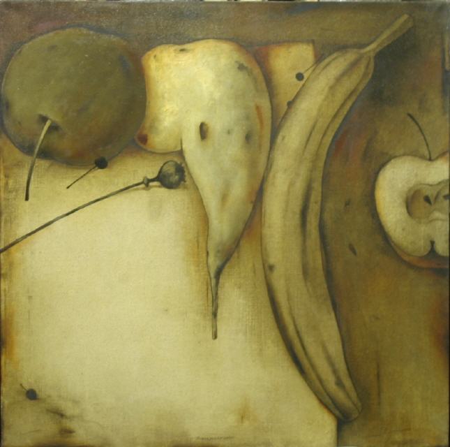 In dieser Ausstellung werden die Arbeiten des Projektes der vergangenen zwei Jahre gezeigt: "Früchte. Von Adam bis Freud." Der biblische Apfel ist jedem bekannt, ebenfalls das Verhältnis zwischen Newton und dieser Frucht. Schon immer waren Früchte Objekte, die das besondere Interesse der Künstler angeregt haben. Als Thema also sehr traditionell, aber auch deswegen besonders interessant, denn dies macht die Suche nach einer neuen, unerwarteten Stilistik, die markant und einprägend ist, notwendig. Darstellung der Früchte in unerwarteten Reduktionen, Suche nach Kompositionslösungen, Frakturfläche, bedingte Farbe, graphischer Charakter der Arbeiten - das sind meiner Meinung nach die wesentlichen Kennzeichen dieser Arbeiten. Aber auch andere Themen finden meine Aufmerksamkeit. Stillleben, oder Architekturlandschaften, Abstraktionen, sowohl Expressive als auch Minimalistische, Collagen mit verschiedenen Materialien (Stoff, Blei, Holz usw.) - und das ist noch nicht alles: die Suche nach Neuem ist andauernd. Ich arbeite ständig, viel und mit nicht nachlassendem Interesse.