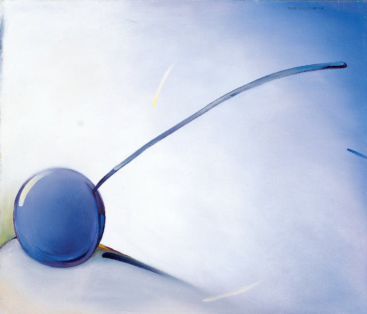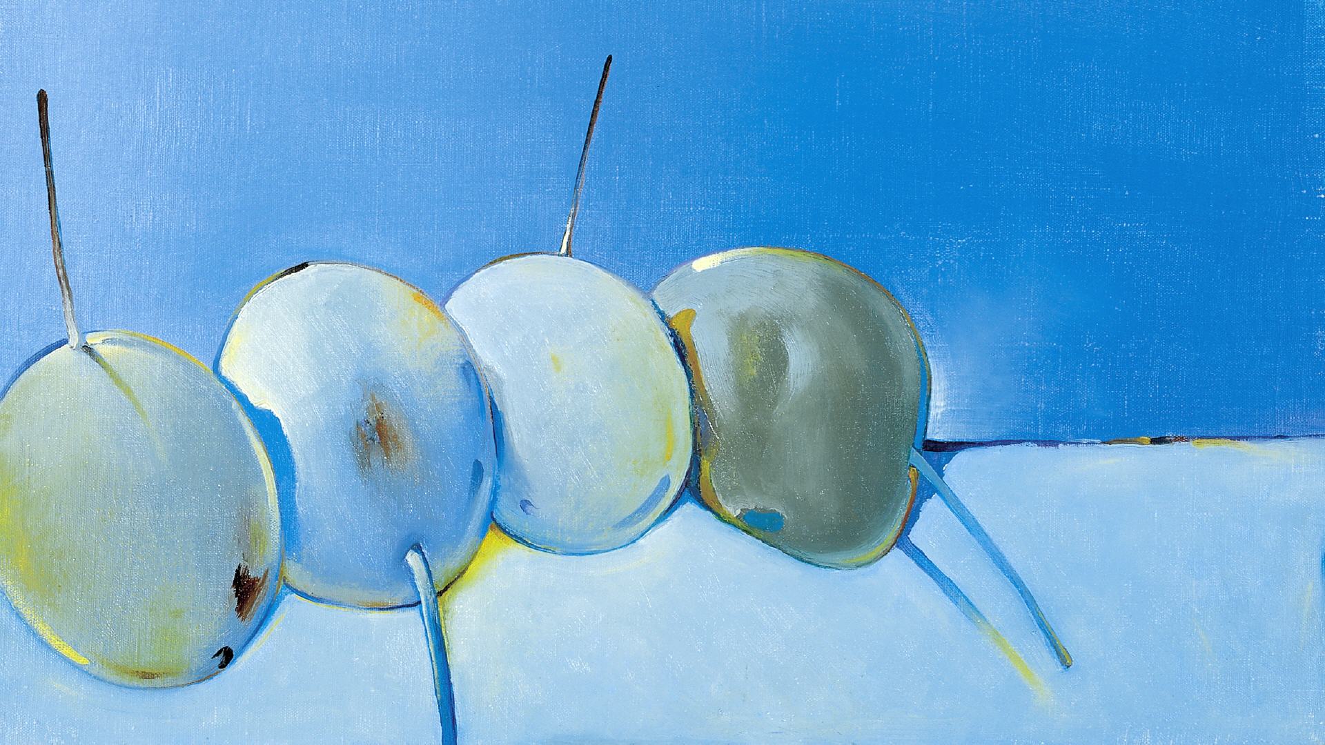 Vier Pflaumen, deren Fruchtkörper sich aneinander schmiegen, liegen auf einer angedeuteten Tischkante. Ihre überlangen Stiele reichen auf der Bildfläche in entgegengesetzte Richtungen, nach oben und nach unten. Die gestellt wirkende Anordnung der Früchte wird durch das vibrierende Blau verstärkt. Das einfallende Licht von der linken oberen Seite verleiht dem Bild Lebendigkeit und Plastizität. Schlagschatten in Form von verdunkelten Farbpartien werden sichtbar. Augenfällig ist, dass sich die gesamte Komposition an den äußeren Bildrand drängt. Dieses Stillleben ist in seiner Bildgestaltung exemplarisch für viele Bilder gleichen Sujets von Alexander Dorofeev. Der Mensch in seiner fruchtbaren Form - AUSSTELLUNGSKATALOG [5.445 KB]
