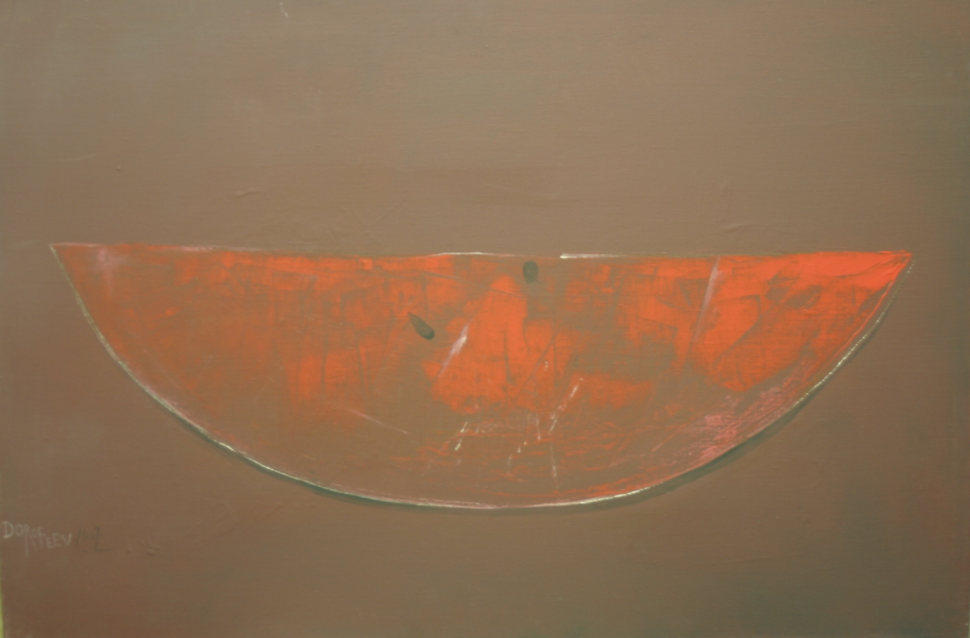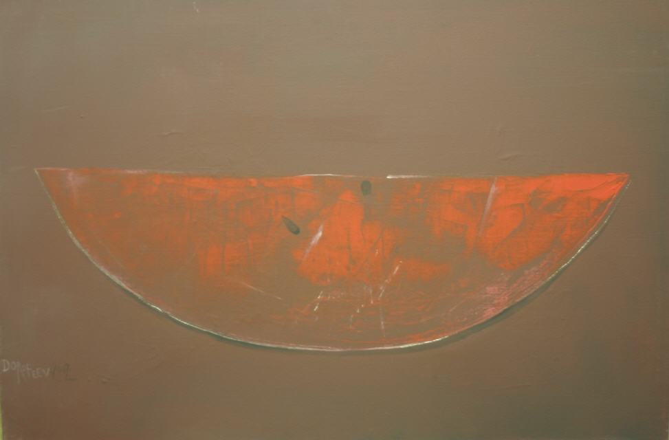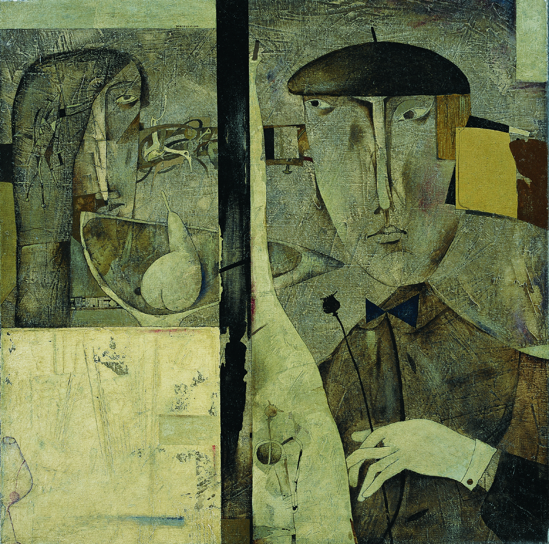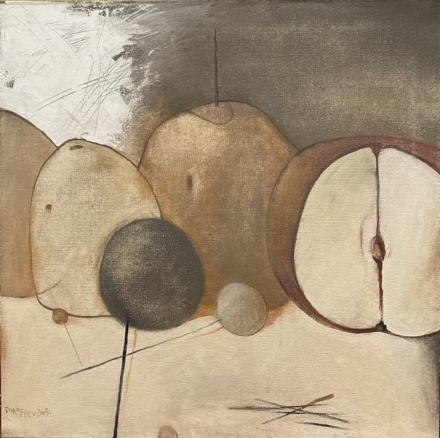 Dass Alexander Dorofeev sich mit dem Menschen und seinen Sehnsüchten auseinandersetzt, ist auch aus seinen eher kubistisch anmutenden Bildern herauszulesen. Auch hier geht es um körperliche Nähe, in diesem Falle zu einem anderen Menschen oder zu sich selbst. im Vergleich zu den Früchte-Stillleben treten jetzt menschliches Antlitz und Akt in den Vordergrund, wenngleich der Künstler die Frucht, insbesondere wieder die der Birne, als ein verbindendes Element in sein Schauspiel miteinbezieht. Selbst in seinen stelenartig aufragenden Formen deutet der Künstler den menschlichen Körper an. Auge, Mund, Taille und Geschlecht strukturieren die Senkrechte.