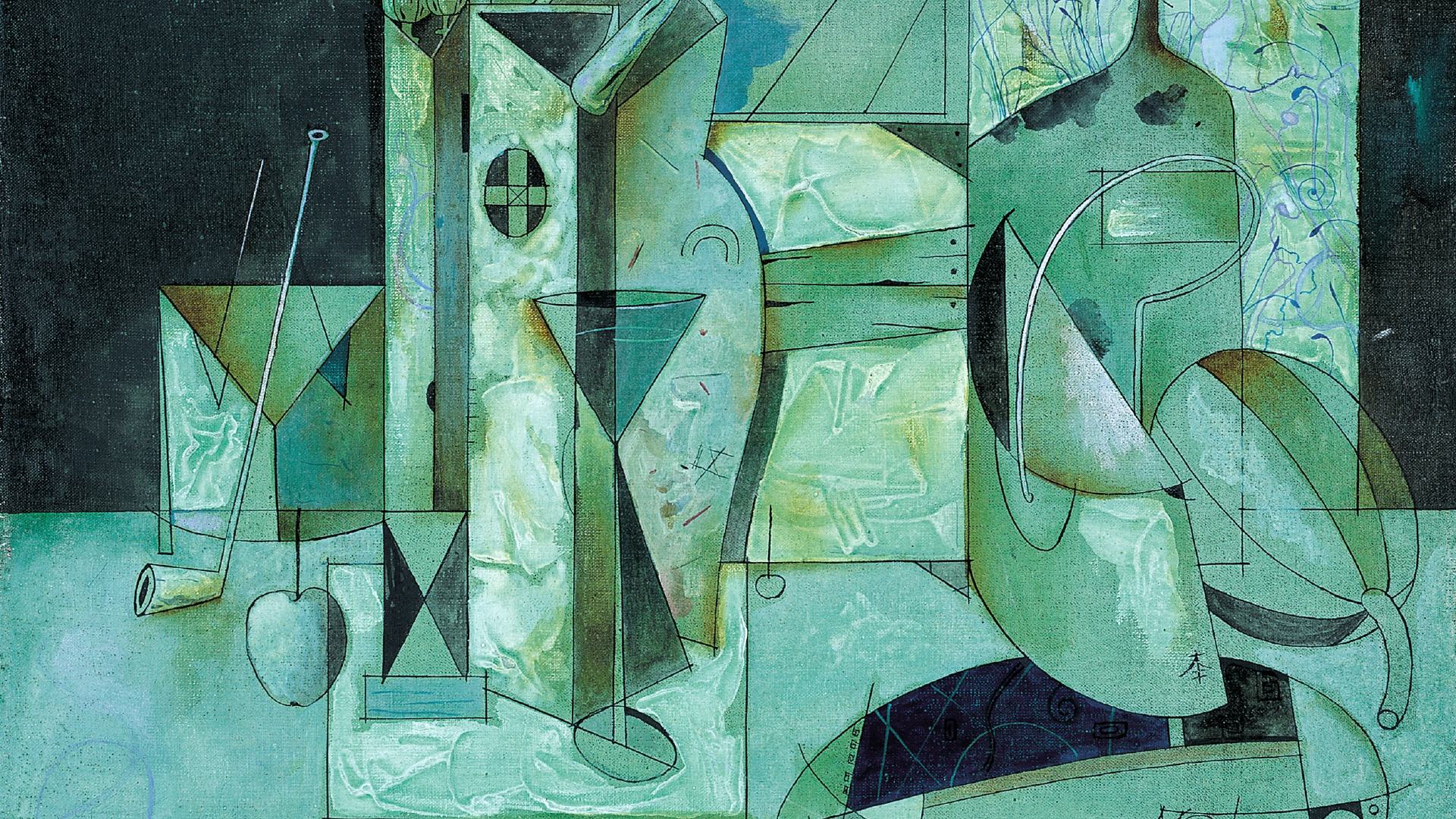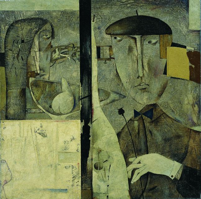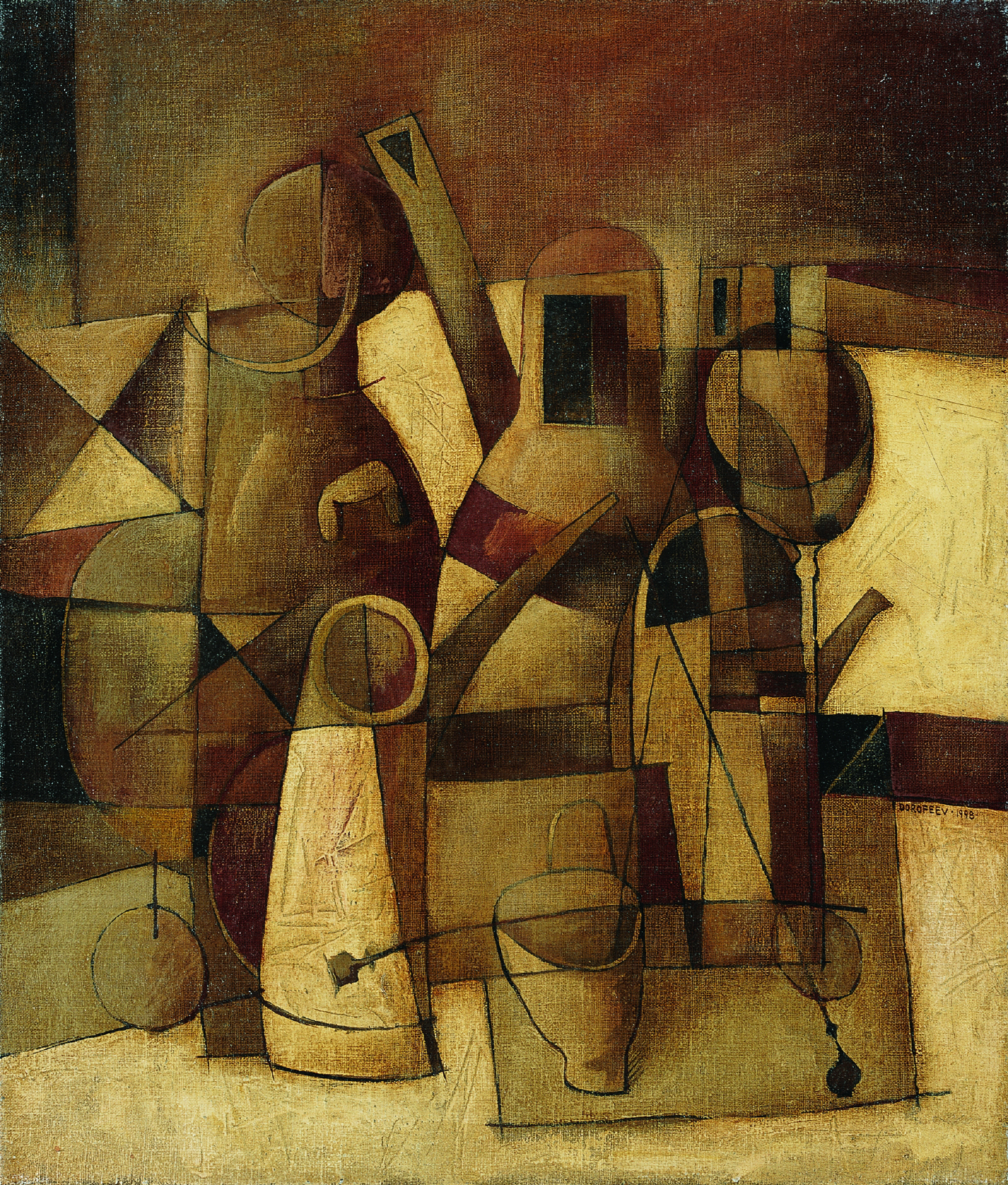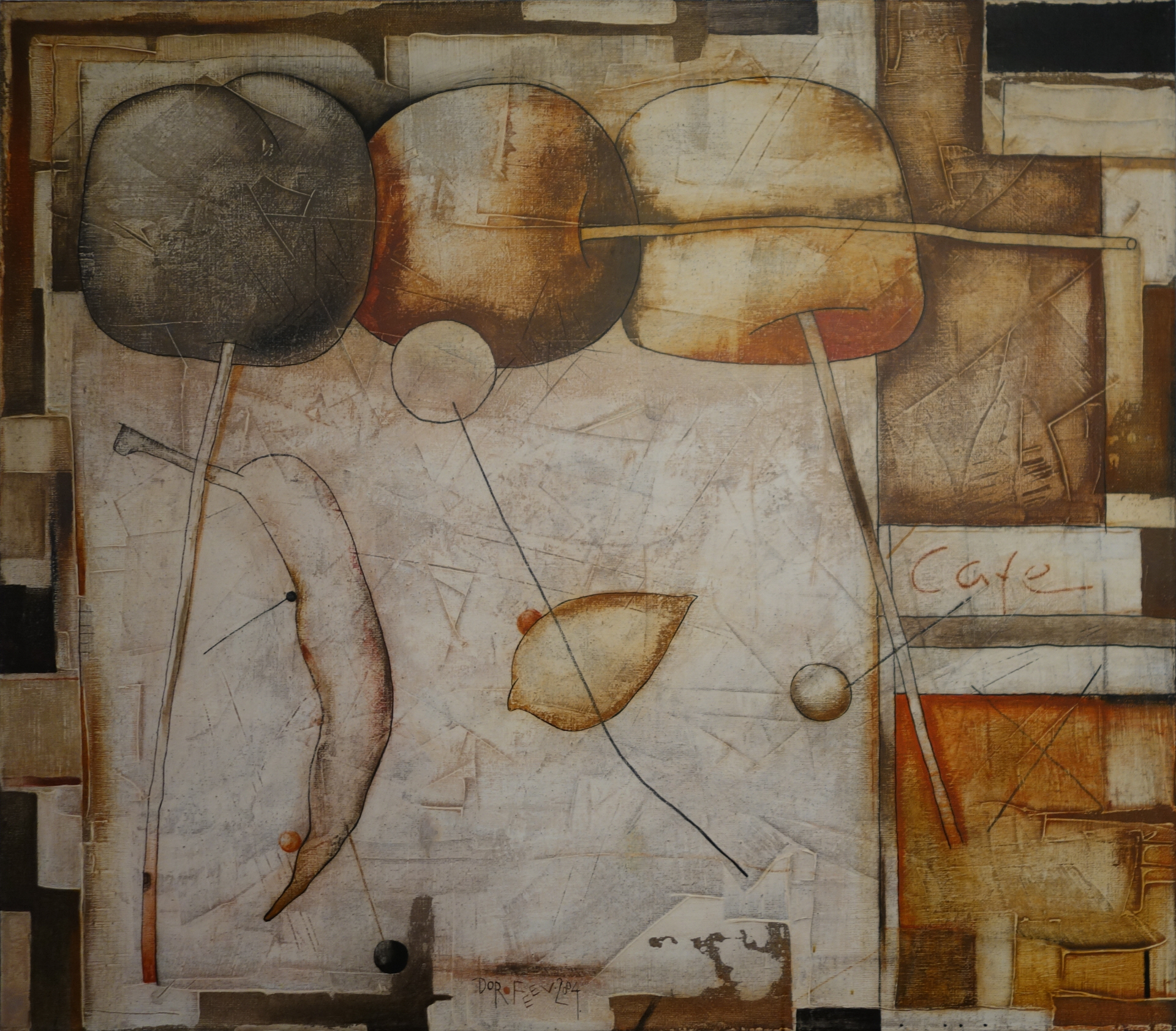 Dass Alexander Dorofeev sich mit dem Menschen und seinen Sehnsüchten auseinandersetzt, ist auch aus seinen eher kubistisch anmutenden Bildern herauszulesen. Auch hier geht es um körperliche Nähe, in diesem Falle zu einem anderen Menschen oder zu sich selbst. im Vergleich zu den Früchte-Stillleben treten jetzt menschliches Antlitz und Akt in den Vordergrund, wenngleich der Künstler die Frucht, insbesondere wieder die der Birne, als ein verbindendes Element in sein Schauspiel miteinbezieht. Selbst in seinen stelenartig aufragenden Formen deutet der Künstler den menschlichen Körper an. Auge, Mund, Taille und Geschlecht strukturieren die Senkrechte.