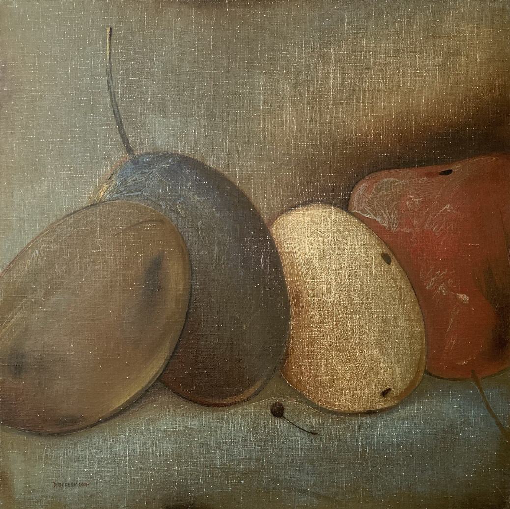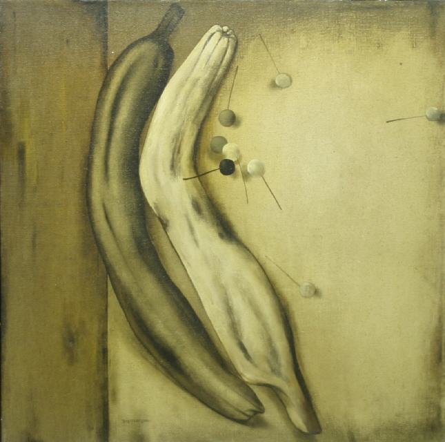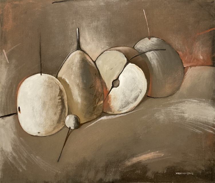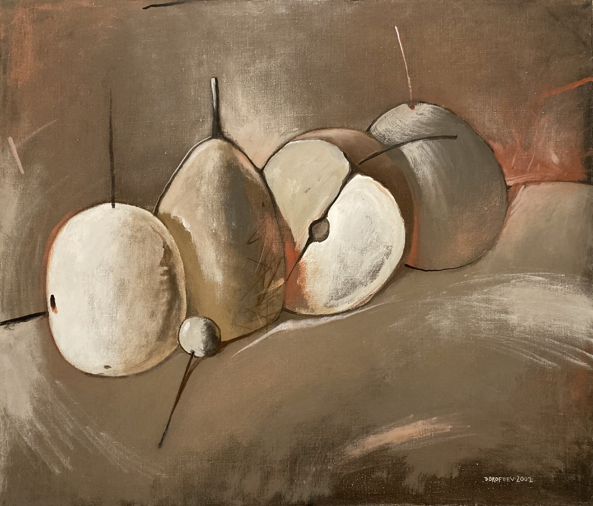 Etwas besonders Reizvolles liegt in der Verbindung, die die einzelnen Obststücke in diesen Bildern miteinander eingehen. Auffallend sind die immer wieder auftauchenden Birnen. Sie biegen und winden sich und erinnern in ihren Verformungen an einen menschlichen Körper. Eine aufgeschnittene Birne, deren Kerngehäuse Dorofeev nur schemenhaft andeutet, drückt sich mit ihren weichen Linien geradezu an einen Apfel an oder auch an die betonten Rundungen einer anderen Birne. Ähnliche Nähe vermitteln zwei hintereinanderliegende Bananen. Das Thema der symbiotischen Verbindung gipfelt in Dorofeevs Darstellung eines liegenden weiblichen Torsos in Birnenform mit einer stehenden birnenähnlichen Frucht. Auf die innere Lebendigkeit des Bildes verweisen die barocken Bewegungen der Obststiele.